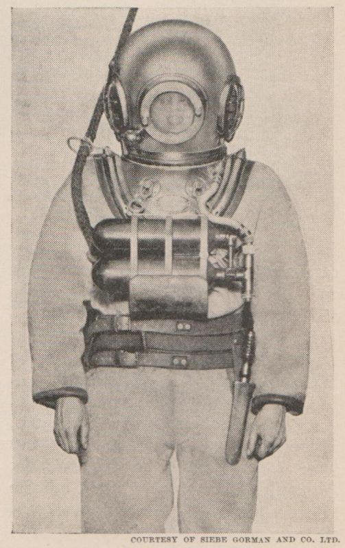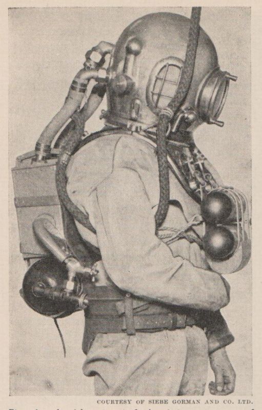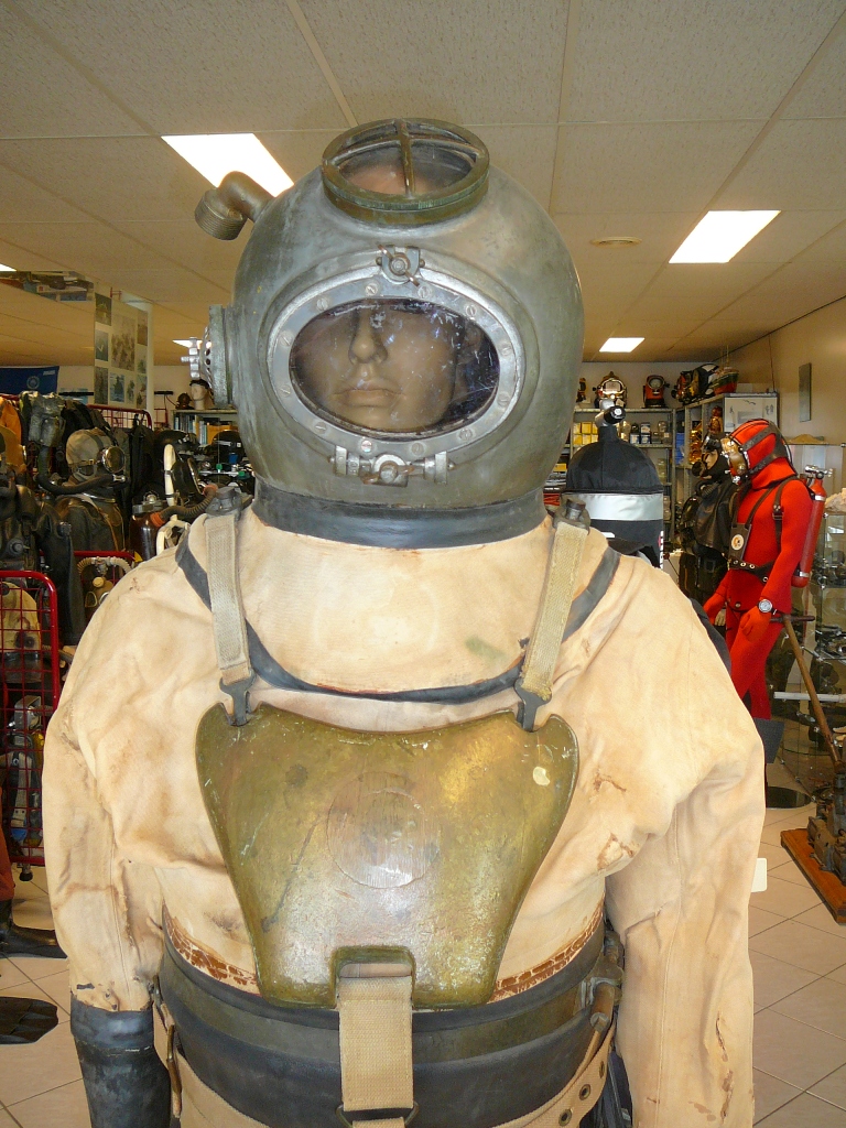 Aber interessant sind auch Helm und Anzug. Der Helm scheint mit dem Anzug fest verbunden zu sein, der Einstieg in den Anzug erfogt wie beim Gürteltauchgerät von Dräger in der Mitte dea Anzugs. Abgedichtet wird der Einstieg wohl mit einem Metallring.