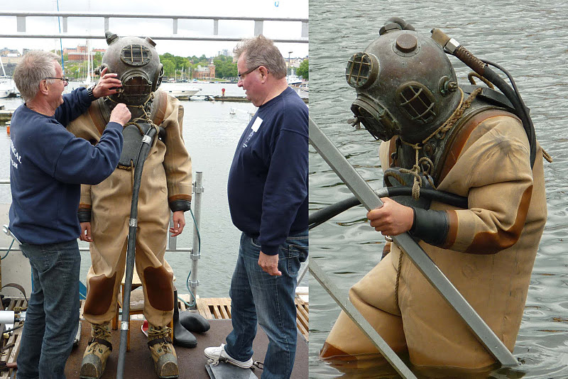 Ja der Siebe Gorman. Ich war so aufgeregt vor diesem Tauchgang. Ich hatte schon am Abend zuvor die Gastgeber gefragt gehabt, ob ich mit dem Siebe Gorman tauchen dürfte, der der SDHF Svensk Dykeri Historisk Förening Gruppe gehörte. Es ist aber auch aufregend, wenn man das Tauchgerät einen Tag zuvor sieht, mit dem man am Nächsten Tag tauchen darf