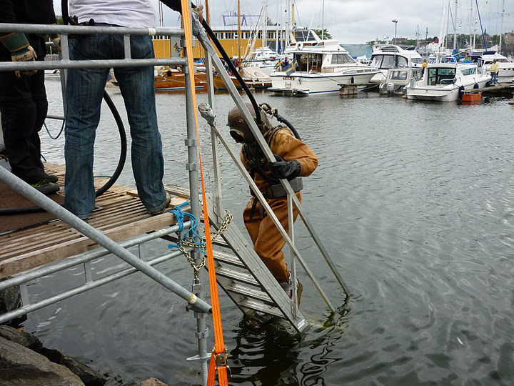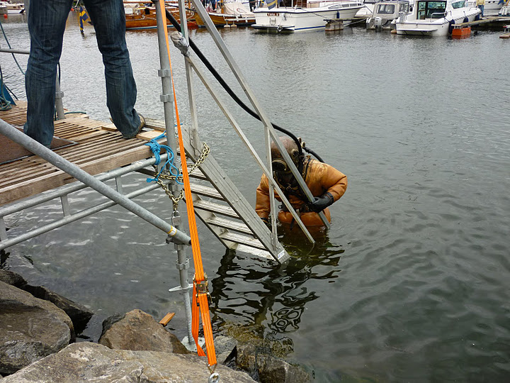 Kurz bevor ich wieder raus musste hatte ich zu sehr am Ablassventil gespielt. Ich hatte nämlich das Ventil soweit zugedreht. Damit blieb die Luft im Anzug und konnte nicht mehr entweichen. So hing ich wie ein Michelinmännchen an der Treppe und kam nicht mehr hoch, weil auch die Beine und Arme voll mit Luft waren kam ich auch nicht mehr von außen ans Ventil ran..